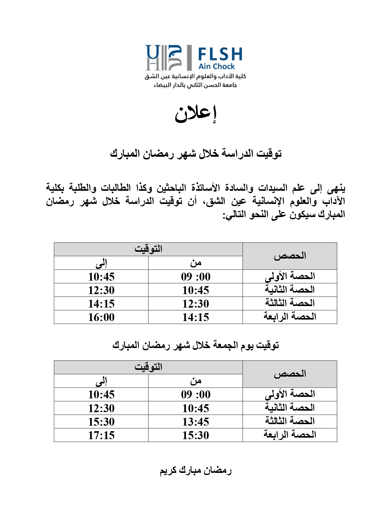 تنهي إدارة كلية الآداب والعلوم الإنسانية عين الشق أن الامتحانات، التي كان من المقرر إجراؤها ابتداء من يوم الإثنين 2 فبراير 2026، قد تم تأجيلها لتُجرى ابتداء من يوم الإثنين 9 فبراير 2026، وفق نفس البرمجة المعلنة سابقًا.